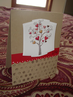 This cute tree stamp is from Hero Arts. I stamped it then put these cute little heart stickers over the stamped hearts on the tree. I added a red scallop edge with LOve sentiment from Papertrey Inks Mixed messages stamp set. The distressed dot are from Unity.